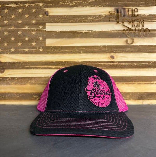 Dads With Beards Ponytail Hat. Hot Pink Leatherette on Pink/Black Ponytail hat. - For Other Color Options or Hat Styles Please Contact Us!
