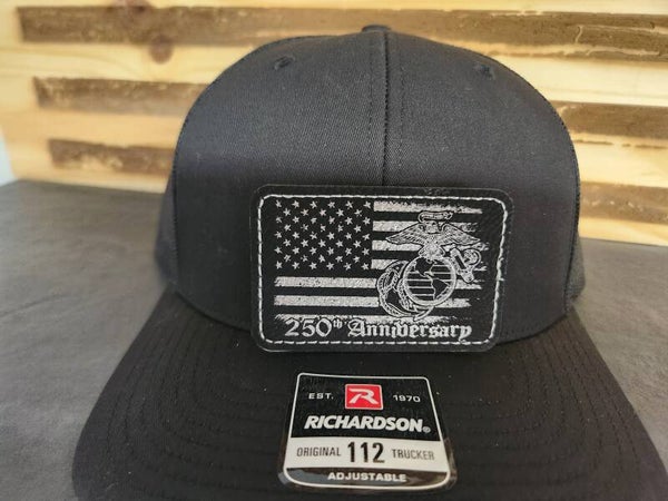 Richardson 112 Mesh Snapback hat with black leather patch engraved to silver. 250th Anniversary Marines logo and american flag.