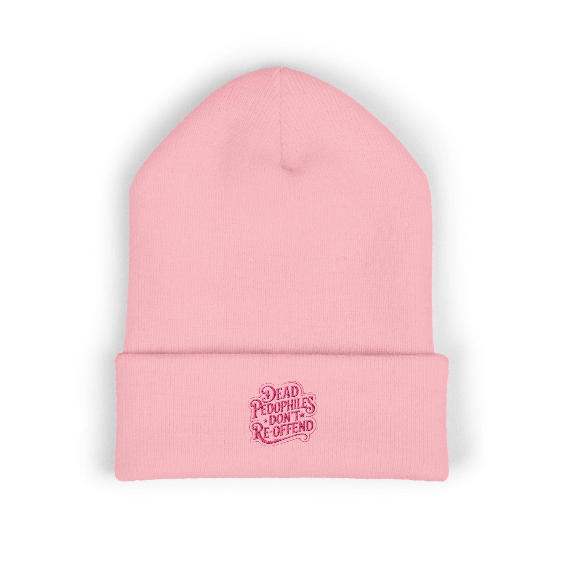 Embroidered Classic Cuffed Beanie with the phrase "Dead Pedophiles Don't Reoffend". Gives off a bold and impactful vibe, perfect for those who want to make a strong statement. Relevant for activists, advocates, and those passionate about social justice. Ideal for wearing during protests, awareness campaigns, or advocacy events.