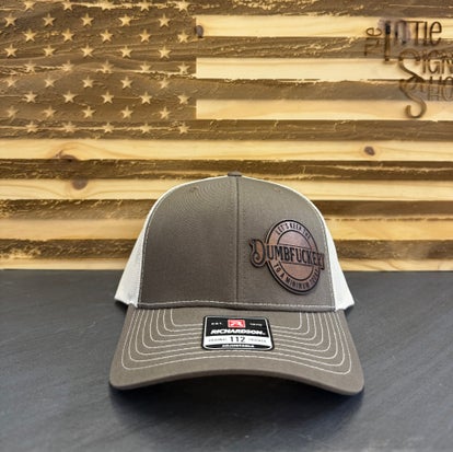 Let's Keep the Dumbfuckery To A Minimum Today Richardson 112 snapback hat. Design on brown leatherette patch, placed on left front of cap.